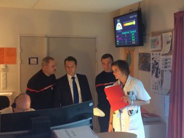 Ce vendredi, Gilles Dufeigneux, Président du CASDIS, a visité le Service d’Aide Médicale d’Urgence du CHBA accompagné du Colonel Cyrille Berrod, directeur départemental, du médecin-chef Philippe Danion, chef du pôle santé et du lieutenant-colonel Gildas Lopéré, chef du groupement opérations.
