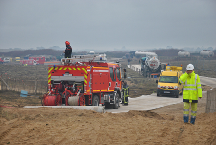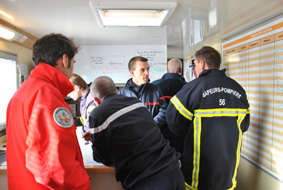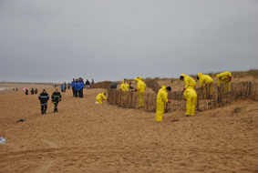 | 4 barrages sont mis en place et une opération de pompage et de dépotage est en cours afin de contenir la pollution. Tous les moyens sont mis en œuvre pour organiser ces chantiers de dépollution avec la mobilisation de 250 pompiers par jour. Huit chantiers sont actuellement en cours de réalisation. 245 m3 de sables pollués ont été extraits. Les sapeurs-pompiers des départements sont venus en renfort. |