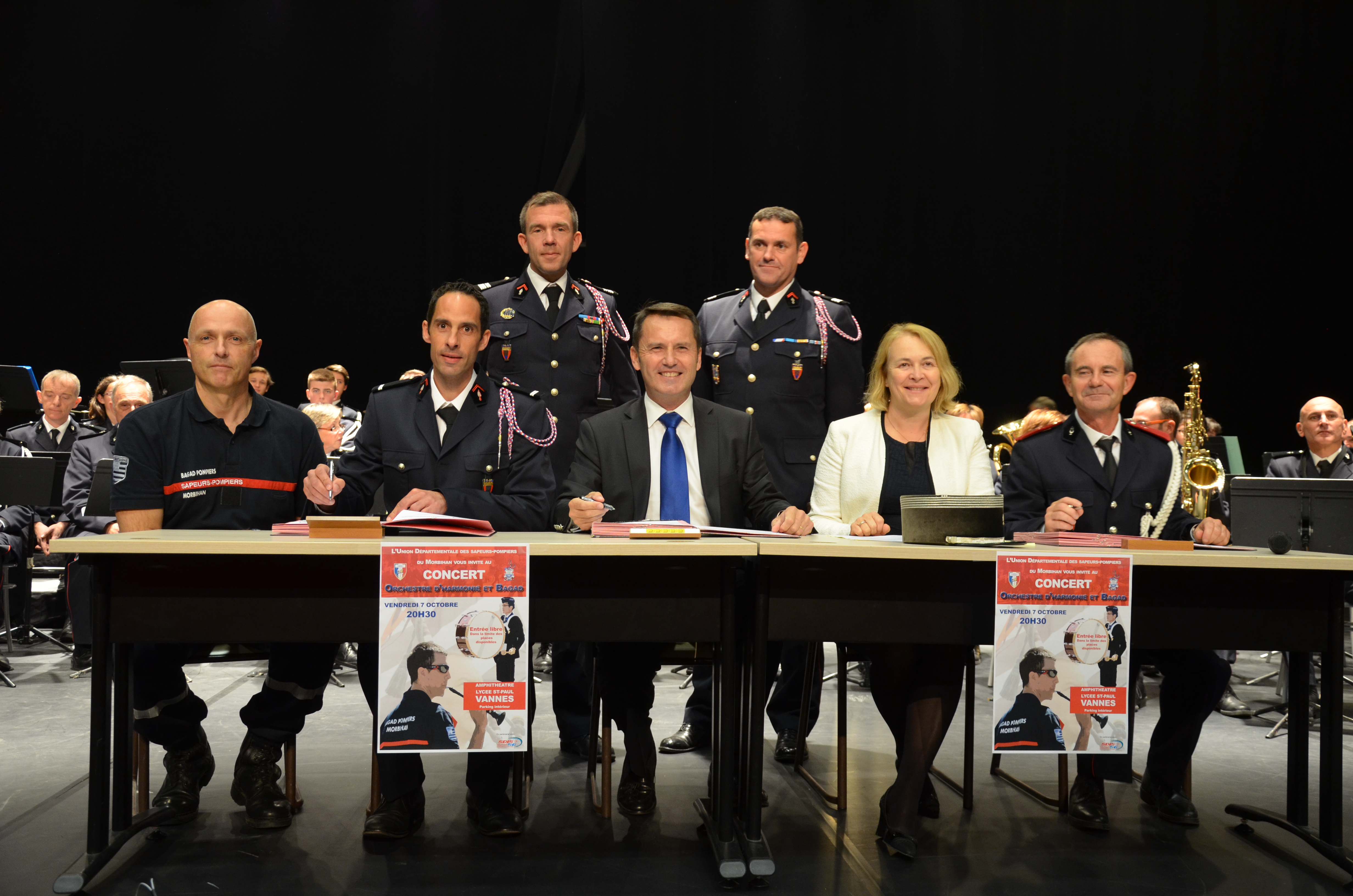 En préambule, une convention a été signée entre les deux associations musicales et le SDIS 56, en présence de Gilles Dufeigneux, Président du Conseil d’Administration du SDIS du Morbihan, du colonel Cyrille Berrod, Directeur départemental du SDIS du Morbihan, de Christine Penhouët, 1ère vice-présidente du Conseil d’Administration, du capitaine Patrice Le Port, Président de l’Union Départementale et des deux présidents d’associations, Yoann Ruellan (Orchestre) et Paul Leissen (Bagad). L’objectif de ces conventions est de soutenir le dynamisme des deux groupes musicaux et de pérenniser leur action, véritable valeur ajoutée pour le corps des sapeurs-pompiers.
