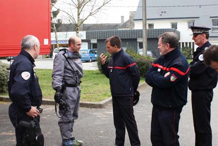 | Suite à l’intervention sur le site de l’entreprise Guerbet fin 2011, une formation aux risques technologiques a été proposée à 53 fonctionnaires de police des commissariats de Vannes et Lorient. Ces derniers ont ainsi pu appliquer leur formation pratique dans la Cellule d’Entraînement de Port d’Appareils Respiratoires Isolants au centre de secours de Surzur. Ils se sont essayés au port d’une tenue étanche et d’un appareil respiratoire dans un parcours étroit de 47m. |