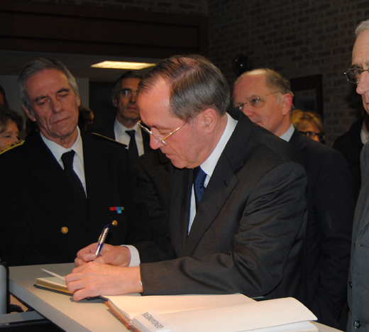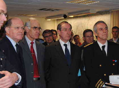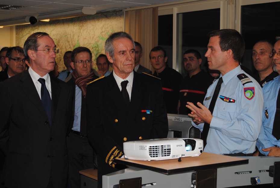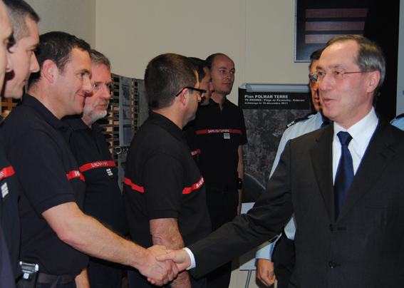 Accueilli par Jean-François Savy, Préfet du Morbihan, François Goulard, Président du Conseil Général et Guy de Kersabiec, Président du Conseil d’administration du SDIS, le ministre s’est rendu sur les lieux où ont été traités les messages d’alerte et leurs opérations au cours de la nuit du 15 au 16 décembre 2011 dernier. |