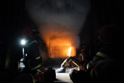 Le caisson est un outil essentiel à l’apprentissage des futures missions opérationnelles. Il s’agit d’un conteneur permettant d’analyser et comprendre les fumées, les couleurs des flammes… Les stagiaires ont pu réaliser 6 brûlages par jour dans les caissons double niveau et flash over. A l’issue, les stagiaires pourront encadrer dans leurs SDIS respectifs des formations théoriques et pratiques sur la connaissance et la lutte contre les feux de volumes.