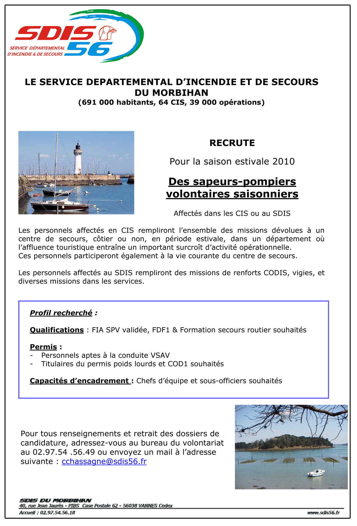 Catégories Actualités Le SDIS 56 recrute surveillants de baignade et saisonniers pour la saison 2010 Auteur de l’article Par SDIS du Morbihan Date de l’article 11 février 2010 ← Cross départemental des sapeurs-pompiers → Feu d’exploitation agricole commune de Priziac