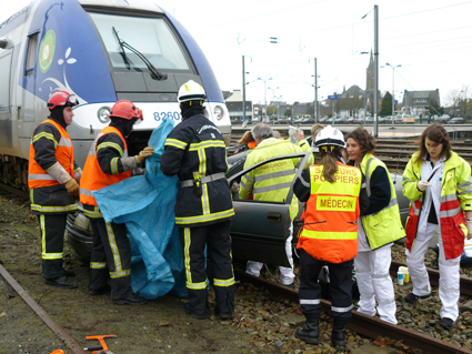 | Jeudi 23 février, un exercice de grande ampleur a été organisé par le SDIS du Morbihan en partenariat avec la SNCF. Le thème retenu : un accident ferroviaire impliquant une voiture bloquée à un passage à niveau et une rame de train express régional. | ![]() |