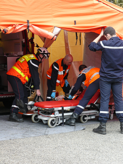 | Organisé de façon régulière sur le territoire, ce type d’exercice a pour but d’améliorer le temps de réponse et l’organisation des interventions en cas de situation semblable.Des observateurs des différents services présents ont pris note des actions mises en œuvre. 1h40 après le début de l’exercice, la totalité des blessés était évacuée des lieux. | ![]() |