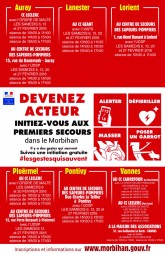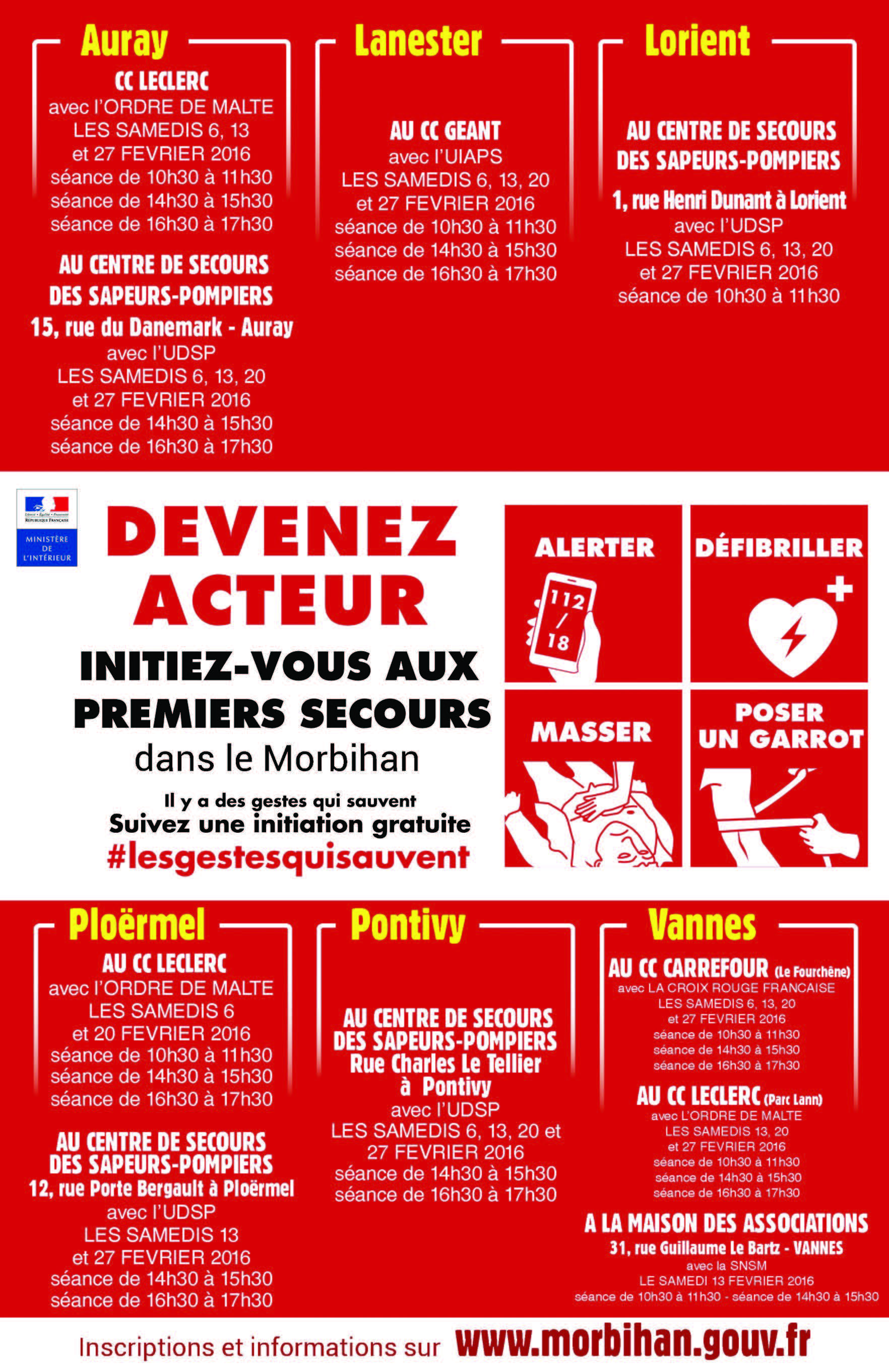 Pour le Morbihan, la préfecture organise sur le mois de février, le samedi, des initiations aux gestes de premiers secours en partenariat avec les sapeurs-pompiers (UDSP), la Croix-Rouge, l’Ordre de Malte, l’unité d’intervention, d’assistance et de premiers secours du Morbihan (UIAPS) et la Société Nationale des Sauveteurs en Mer (SNSM).