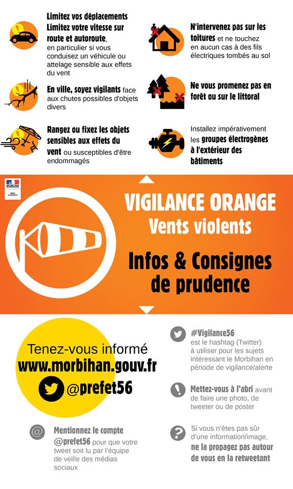 Météo France place le département du Morbihan demain matin, 3 février 2017, en vigilance orange pour risque de vagues-submersion de 6h jusqu’à 11h du matin et vents violents de 7h jusqu’à 16h.