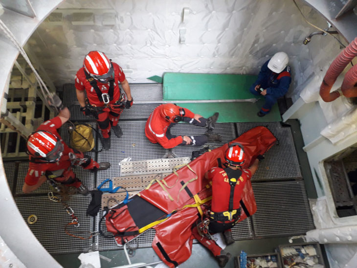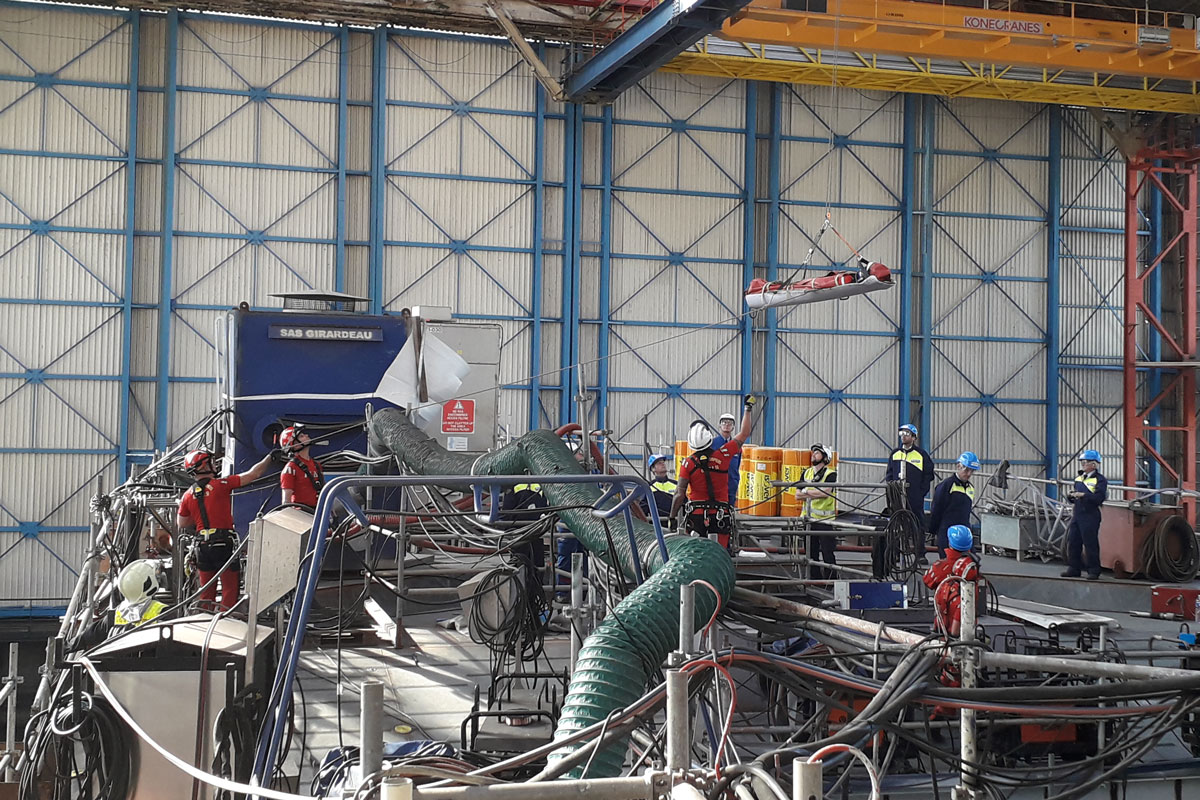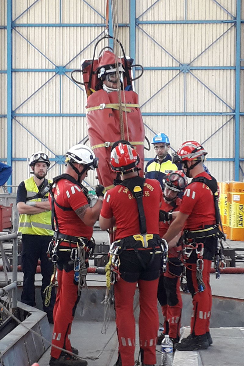 A cette occasion, une équipe du GRIMP, spécialisée dans les interventions en milieu périlleux, a effectué un exercice en conditions réelles, en simulant la sortie d’une victime depuis l’intérieur d’un navire en construction. Cette manœuvre s’est déroulée devant la délégation menée par Gilles Dufeigneux, Président du CASDIS, le Contrôleur Général Cyrille Berrod, directeur départemental et le lieutenant-colonel Gildas Lopéré, Chef d’Etat-Major Opérationnel.