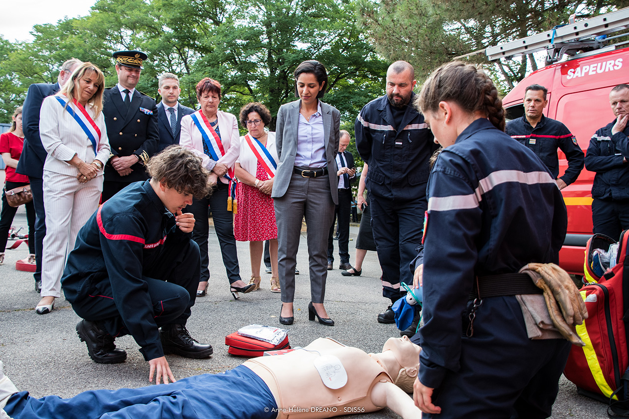 La Secrétaire d’État auprès du ministre des Armées et du ministre de l’Éducation nationale et de la Jeunesse, chargée de la Jeunesse et du Service national universel a rencontré des jeunes sapeurs-pompiers en cours de formation dans le Morbihan. 8 jeunes, des sections de Grand-Champ et Locminé ont effectué deux manœuvres : une manœuvre incendie avec la réalisation d’un établissement de tuyaux et une manœuvre secourisme avec la réalisation de gestes de premiers secours.